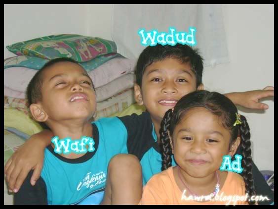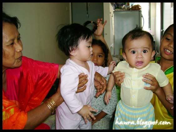 ![]() ![]() .: Friday, January 26, 2007 :. :: We went to chow kit last saturday. Our intention? Nothing specific, just window shopping thru the streets of Chow Kit. And guess what we saw? ![]() Yes..BIG, fully grown, adult men loitering in front of an electrical goods shop, watching WWF Smackdown (betul ker nama show ni?). Why eh? What is it with men & wrestling eh?? I don't understand lah! everywhere I go, where there's a TV screen showing wrestling, there u will find A LOT of men, either the ones sitting, standing, squatting down..nasib baik takde yang bar-ing (read : lying down). Just look at the pic! Siap duduk bersila lagik tuh..haizzz what is it with men & wrestling? Is it in their genes or something?? Anyway, this entry is actually not abt men & wrestling. Just wanted to share with u all the pics that me & hawra took that day ^_^ ![]() ![]() ![]() And last week too, my sister in law & her family, with mum in law included, came to our humble home. Hawra was sooooo happy. Ye lah, member dekat rumah cuma kawan dgn mummy dia aje.. so, when all her kuzzens came, wahhh!! she was soooo excited! i think my daughter will grow up to be a VERY friendly girl. ![]() Hawra with her Mak Umi, kuzzen Ad & Afreen. ![]() The picture itself explains their names ^_^ ![]() The latest addition to Kak Kin's family - Noor Afreena. Cute eh? Oklah...my angel dah bangun...it's playtime!!!! ![]() love as always by zaLin @ 2:49 PM