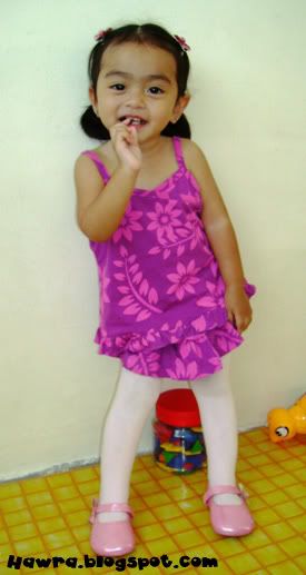 ![]() ![]() .: Friday, December 14, 2007 :. :: ![]() Now I know I keep repeating the same words over and over again each time the 14th comes, but I have to say it again. TIME SURE DOES FLY BY. There, I said it. Shoot me. Can you believe it? Today Hawra turns 22 months. In exactly 2 months from now, she's going to turn 2 . As much as I am looking forward to the day, I am also dreading the fact that Hubs may not be able to join us on Hawra's big day. :( Oh well. Too early to panic, innit? aaaaanyway. Alhamdulillah, Hawra is a healthy active toddler. To date, she has only had flu about 3 times, and fever, erm, 3 times too? Recently, she had a slight temperature because of teething. She's quite a fussy eater, like she has always been. Sometimes she would eat like there's no tomorrow, but sometimes she would simply clamp her mouth shut and refuse to eat anything we feed her. Her vocab has also expanded, and I don't think I quite remember all the words she now knows. Some of the words that I do remember are: Mommy, Daddy, Mak (Hub's mum), Ma' To' (my mum), A-yah (Hub's Dad), Ka-kak (Kakak), Baby [points to herself :) ], Cat, Dog, Sheep-sheep (her fave soft toy-she adores it so much), lion, hoss (horse), fishie (fish), teddy, bunni (bunny), binky, blankie, shoe, socks, milk, yak (when she make poopoo), shee-shee, car, haa-gis (her huggies diapers), monkey, a-syik (nasi), eat, no, yes, o-kay, uh-oh... there's quite a number more, but tak ingat ah! Additional body parts she knows : Head, feet, bum Me: baby, show me your bum. Hawra : (pats own diapered bum) Current faves : Hi-5, Sesame Street (thank GOD for youtube) and *gasp* BARNEY! Loves mirrors, helping me with the laundry (this always makes my heart melt!), playing dress up with me (yes, me. You should see her purse her lips when she sees me applying lipcolor. lol!), pose for the camera, (try to) sing along her fave tunes, and of course, dancing! Speaking of fave tunes, in addition to the nursery rhymes cd she will ask me to play for her everyday without fail (more than 10x weh!), she has one current favorite song. One day, we were tuning in to Fly.fm, and Fergie's Big Girls Don't Cry was on air, and she sang along! Well, not the whole song, of course. Just the "Don't Cry" part. But it sounded more like "Don Kwaaai...don kwaaaiii" Hahahaha!! :) Am I overdoing it? Too much information eh? :) ................................................................... Ok, ok..moving on to the pictures :) ![]() With her sheep-sheep. Posing for the camera. ![]() ![]() ![]() At Equatorial Bangi. ![]() ![]() ![]() With Daddy on the merry-go-round. And finally, the pictures taken on The Eye On Malaysia. Yes, finally I got myself a new charger. ![]() With Kakak Ad, waiting for our turn. ![]() We're almost there! ![]() Me? Hyperventilate? where got?! ![]() Admiring the view from the top. ----------------------------------- Happy 22nd months, darling. You are exactly who you are. My love. My angel. My baby. Labels: dates2remember, digiLOs ![]() love as always by zaLin @ 3:11 PM